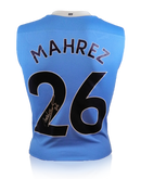 A Manchester City signed shirt by Riyad Mahrez. So far in his Manchester City career his has won 9 trophies with the club which include 3 Premier League titles, 1 FA Cup, 2 Community Shields and 3 League Cups in a row.
