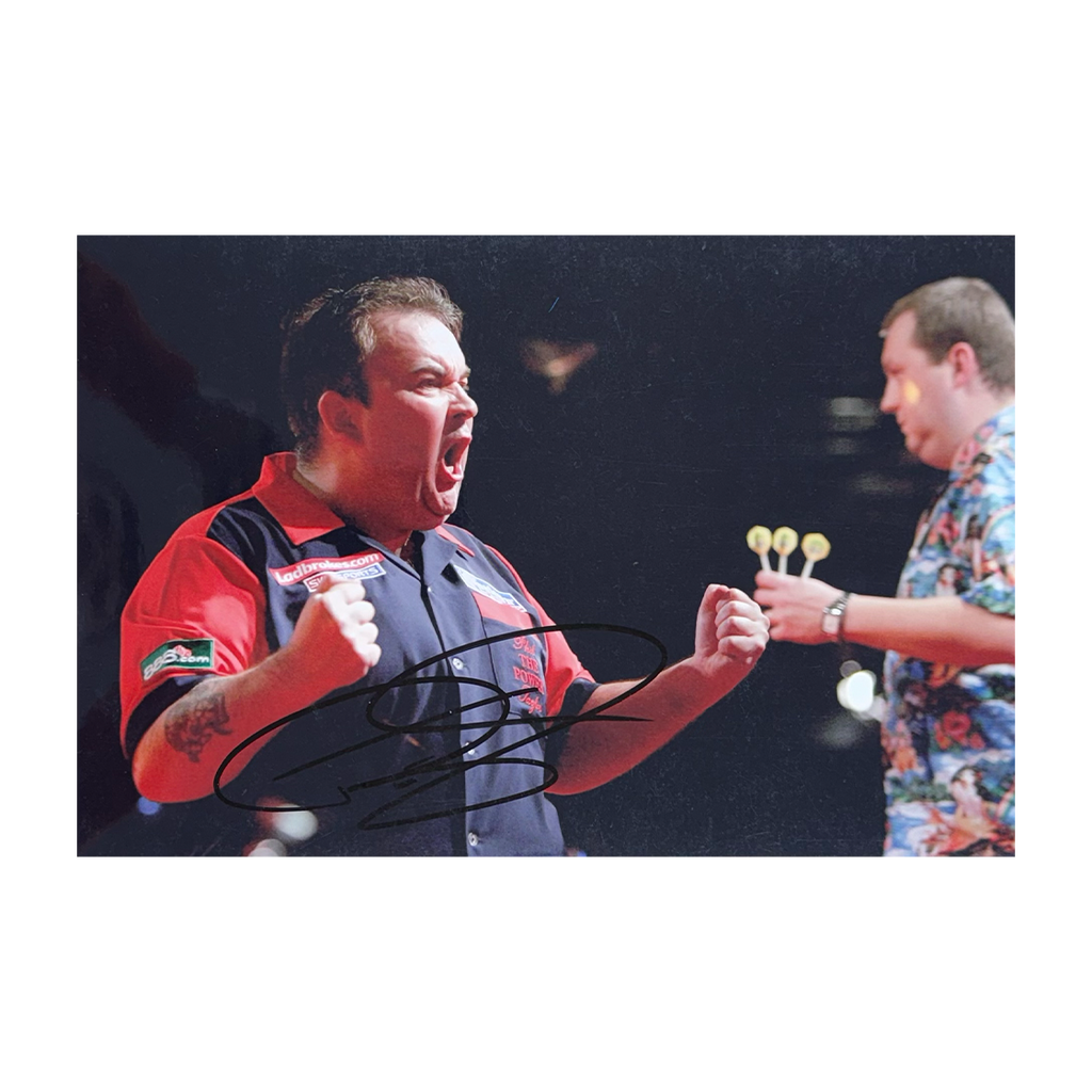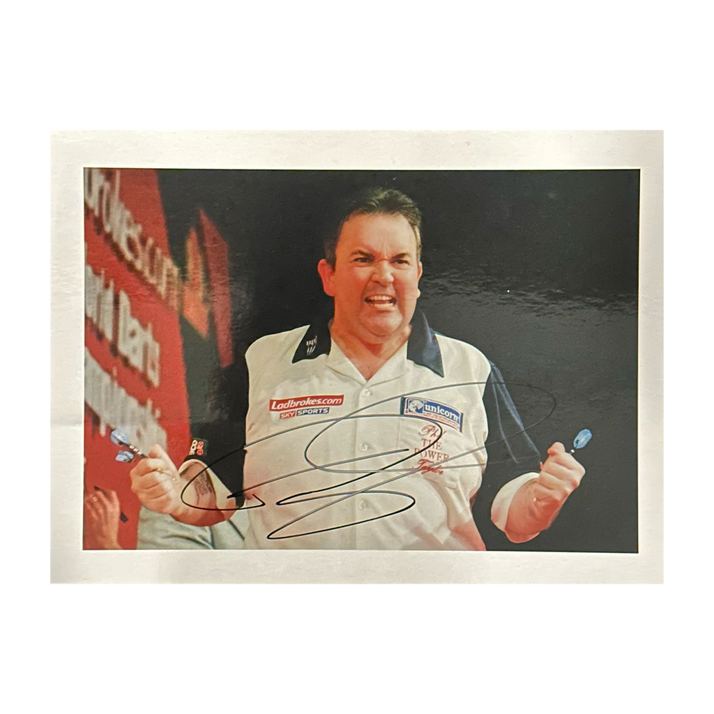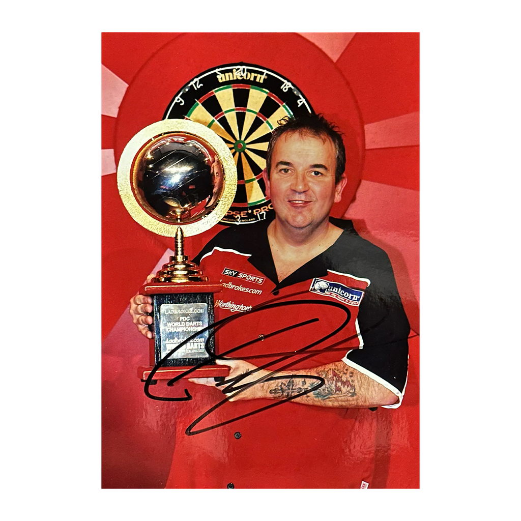 A signed Phil Taylor 16x12 image in a Deluxe Mount. This item measures approximately 500mm x 400mm. This item is accompanied with an certificate of authenticity from The Fan Cave.