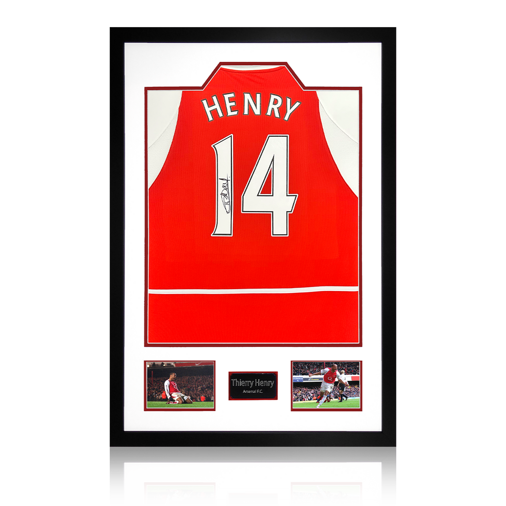 Beautifully presented Premium Frame with signed Arsenal shirt by Thierry Henry. The frame measures approximately 850mm x 600mm. This item is accompanied with an certificate of authenticity from The Fan Cave.