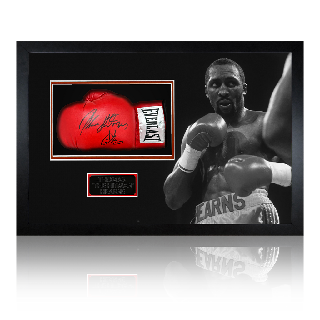 Framed display containing a pair of boxing shorts signed by Thomas 'Hitman' Hearns.