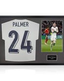 Framed shirt presentation signed by England striker Cole Palmer. This framed display contains a signed shirt, a custom plaque and an iconic image at England. This item was signed at an exclusive Fan Cave signing with Cole on 29/08/24.