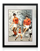 A signed 16x12 mounted image in a frame of Dutch legend Johan Cruyff. As a Dutch international, Cruyff played 48 matches, scoring 33 goals. The national team never lost a match in which Cruyff scored.