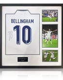 3 photo signed shirt display by Jude Bellingham. This item measures approximately 820mm x 820mm. This item is accompanied with an certificate of authenticity from The Fan Cave.