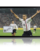 Wooden framed poster mount display containing a signed card from English Football star Michael Owen. He competed in 89 games for the Three Lions scoring 40 goals. He was known for being a prolific goal scorer and the only player ever to have scored in four major tournaments for England.