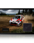 Poster mount framed display World Rally Champion; Ott Tänak driving the Toyota Yaris WRC. This presentation in a wooden frame contains an etched plaque and a card that has been signed by the 2019 champion. This would make a great addition to any rally or motorsport collection