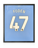 Shirt display signed by Phil Foden. He came through the Manchester City Academy all the way to the first team where he has cemented himself under Pep Guardiola as one of the most talented youngsters in world football which has earnt himself the nickname "The Stockport Iniesta" from the fans at the Etihad.