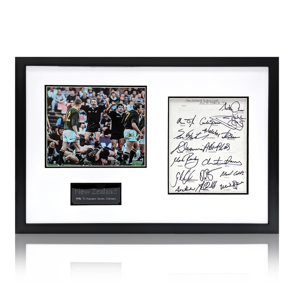 Wooden framed New Zealand All Blacks 1996 Signed Tour Sheet display. This item comes with an The Fan Cave Memorabilia certificate of authenticity.