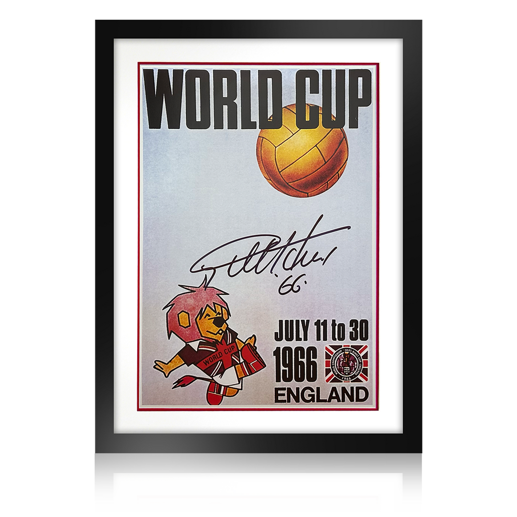 Wooden framed poster of "World Cup Willie" the mascot of the 1966 World Cup Championship. This has then been signed by Geoff Hurst that won the World Cup final with the inscription "66.".