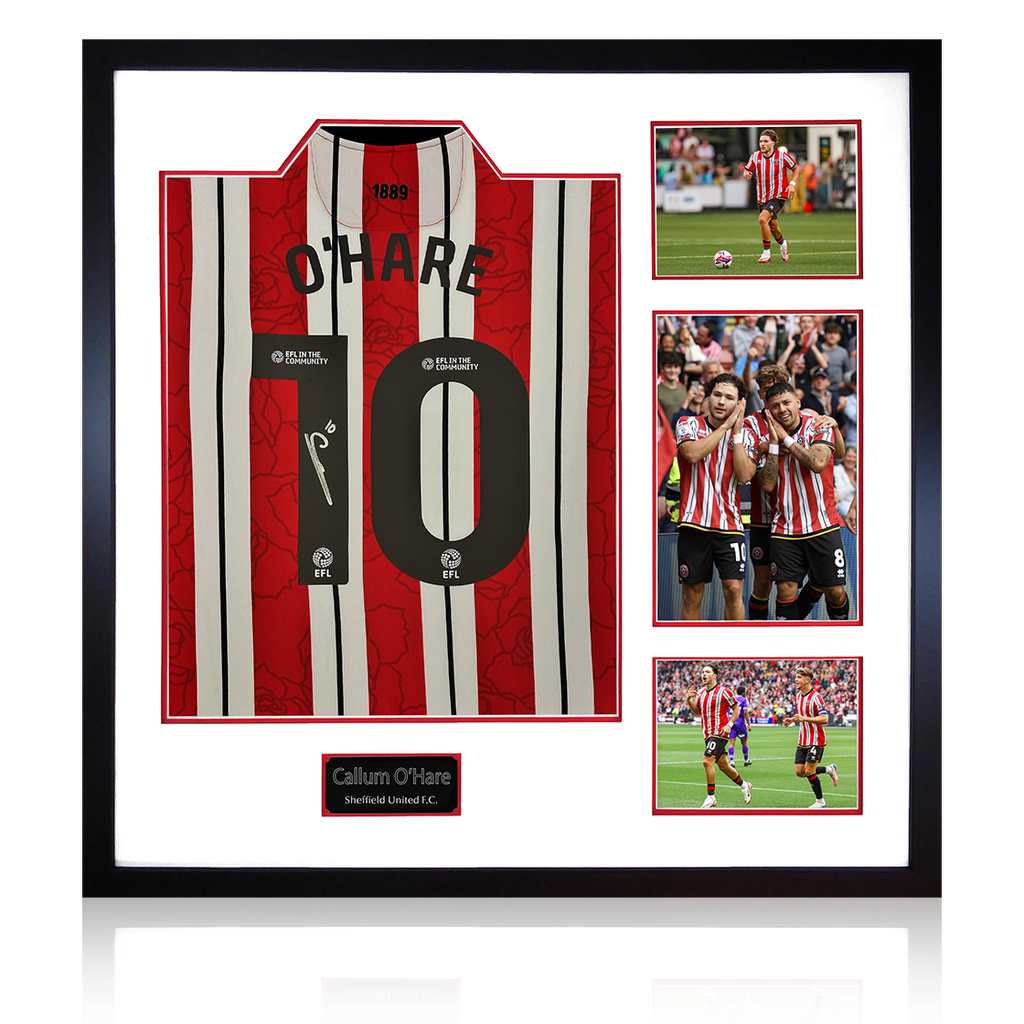 Wooden framed SUFC display containing an etched plaque and a shirt signed by midfielder Callum O'Hare. These are Sheffield United official shirts by signed at a private signing exclusively with The Fan Cave in 2024!