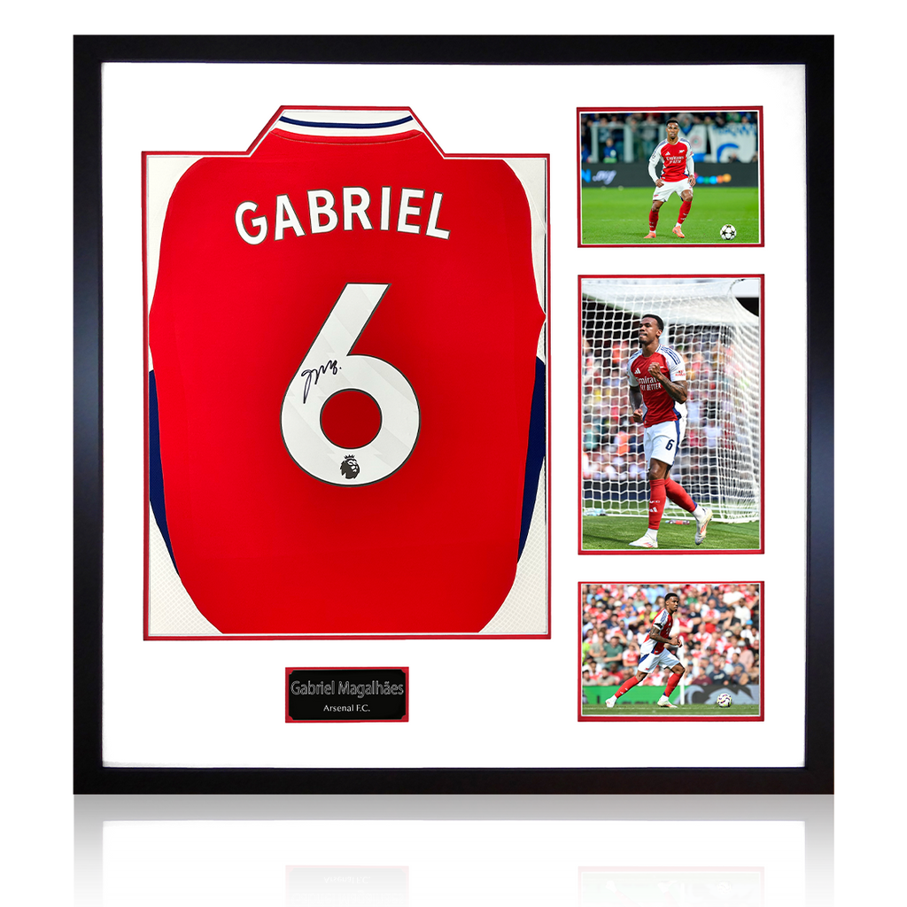 Beautifully presented Elite Frame with signed Arsenal 24/25 shirt by Gabriel Magalhães. This item was signed at an exclusive Fan Cave signing with Gabriel on the 13/12/23. The frame measures approximately 820mm x 820mm. This it...