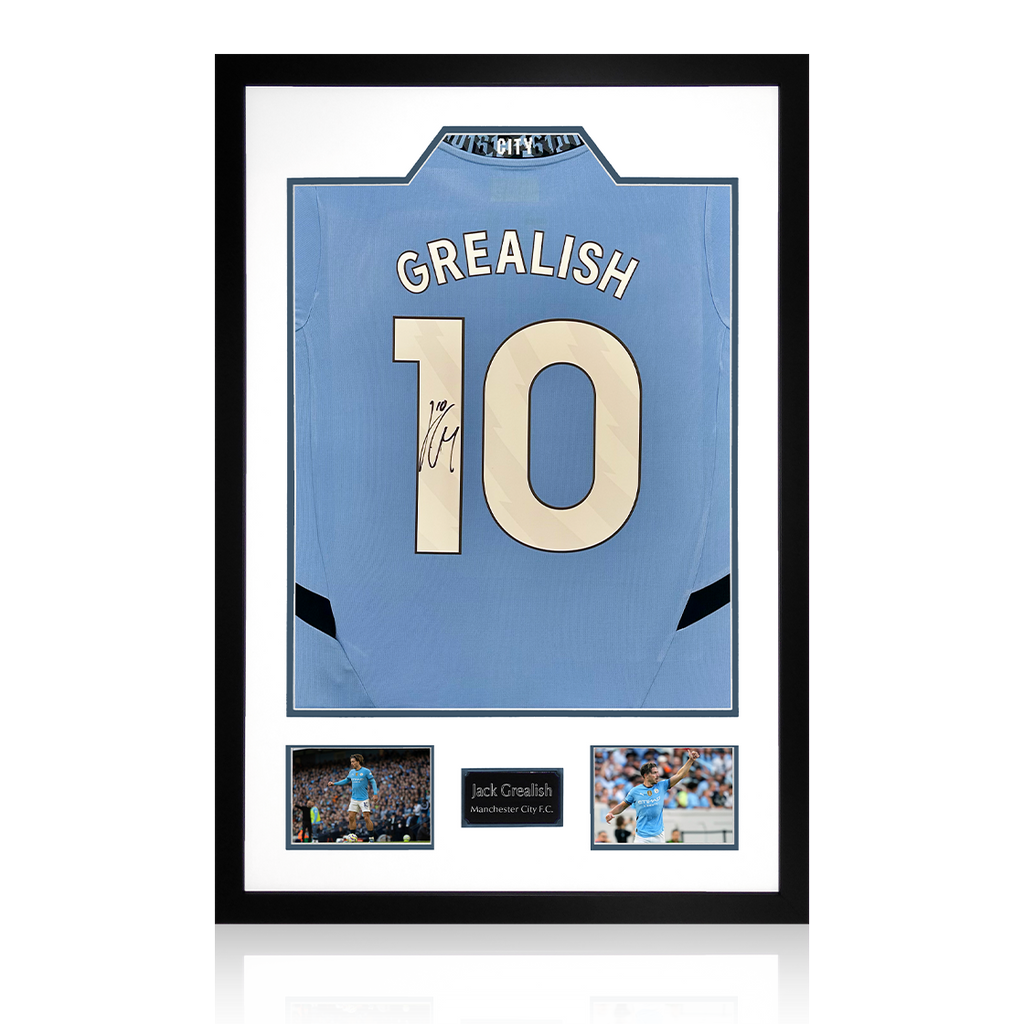 2 photo signed shirt display by Jack Grealish. He signed for Manchester City on 05/08/21 where he signed for a fee of around £100,000,000 which would make him the most expensive transfer of an English player in football history.