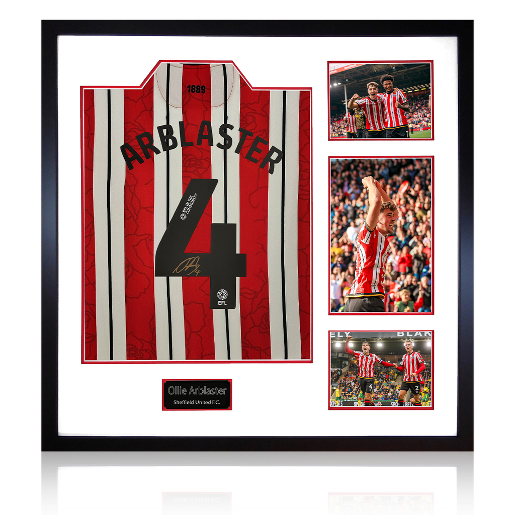 Wooden framed SUFC display containing an etched plaque and a shirt signed by midfielder Ollie Arblaster. These are Sheffield United official shirts by signed at a private signing exclusively with The Fan Cave in 2024!