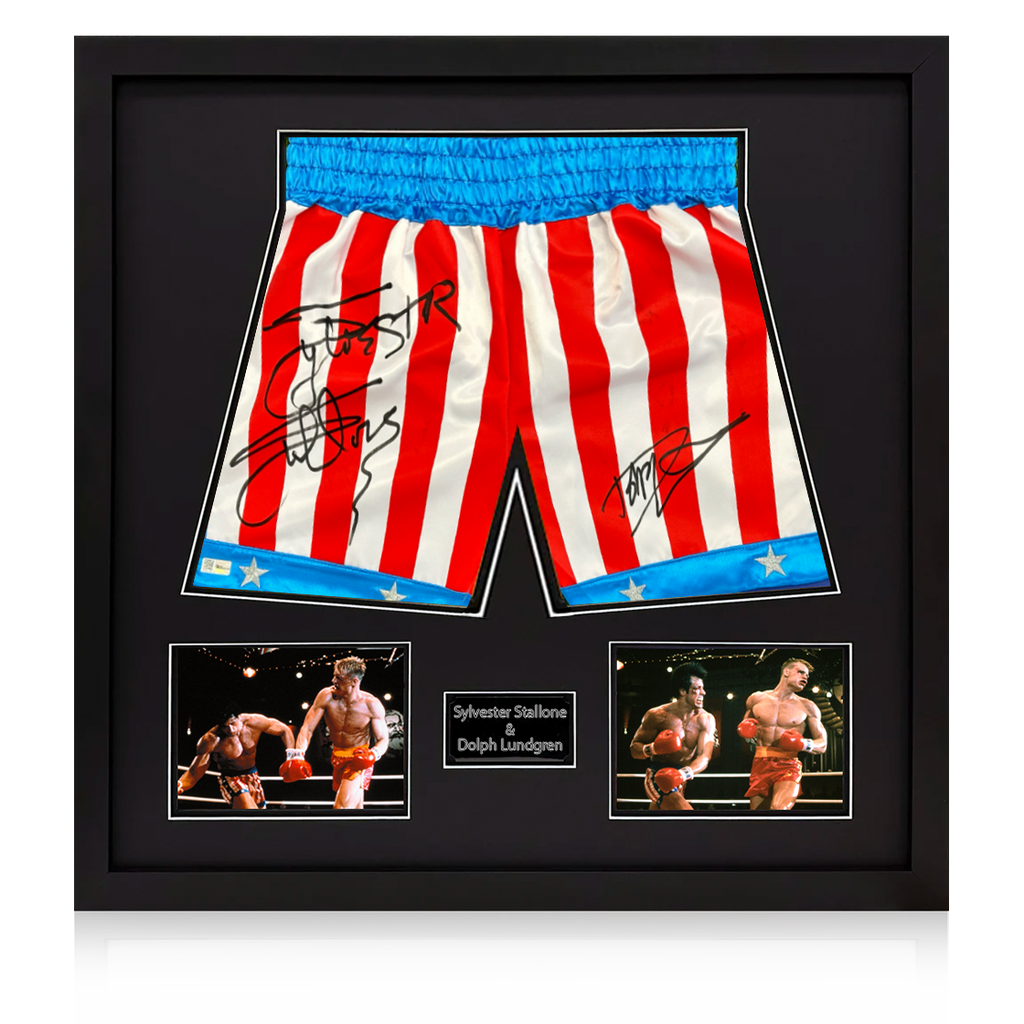 Signed shorts by Sylvester Stallone and Dolph Lundgren from the Rocky franchise. The autograph includes an official Online Authentics serially numbered hologram for authenticity purposes. The signing of this item was witnessed ...