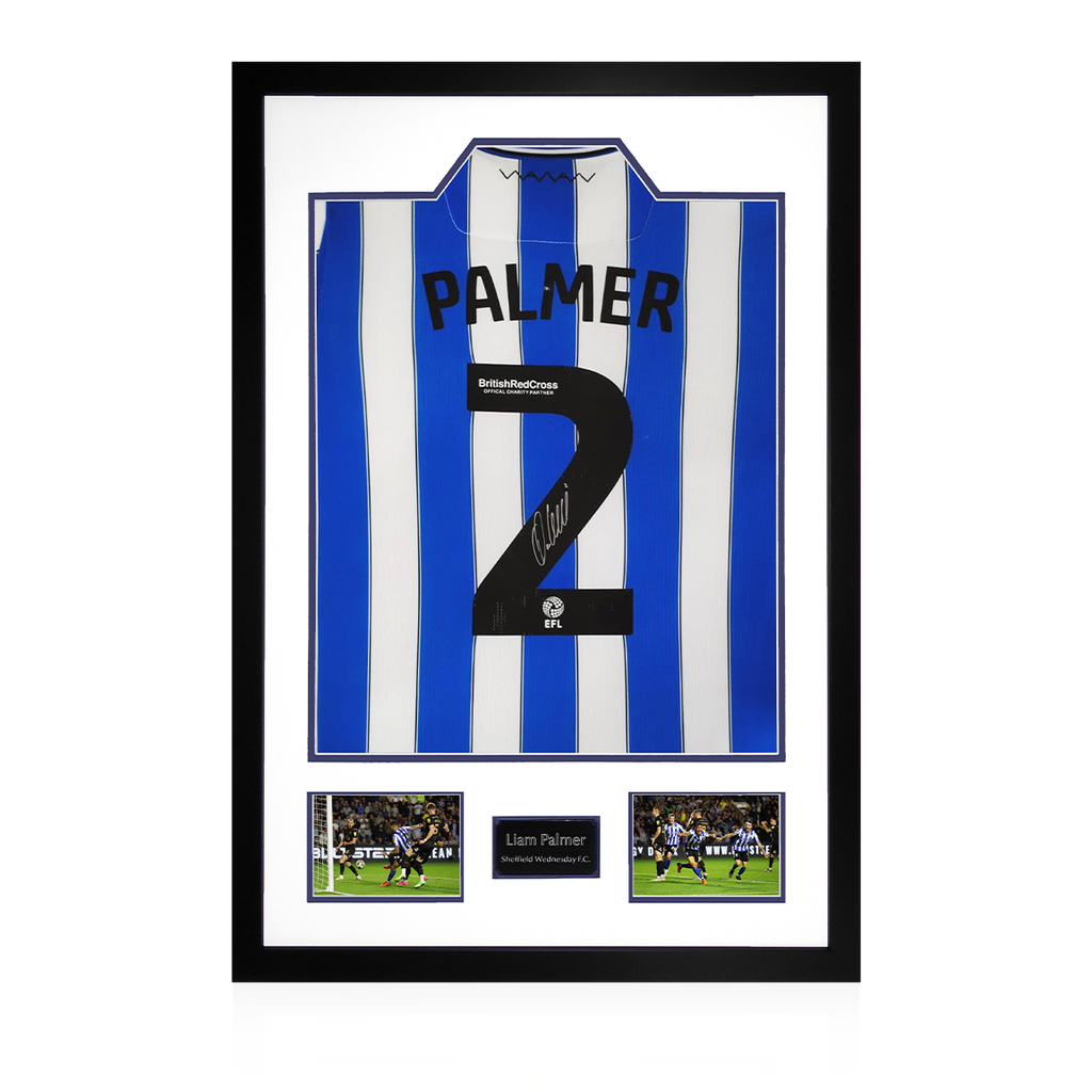 Wooden framed SWFC display containing an etched plaque, two photos and a shirt signed by Liam Palmer. These are Sheffield Wednesday official shirts by signed at a private signing exclusively with The Fan Cave in 2023!