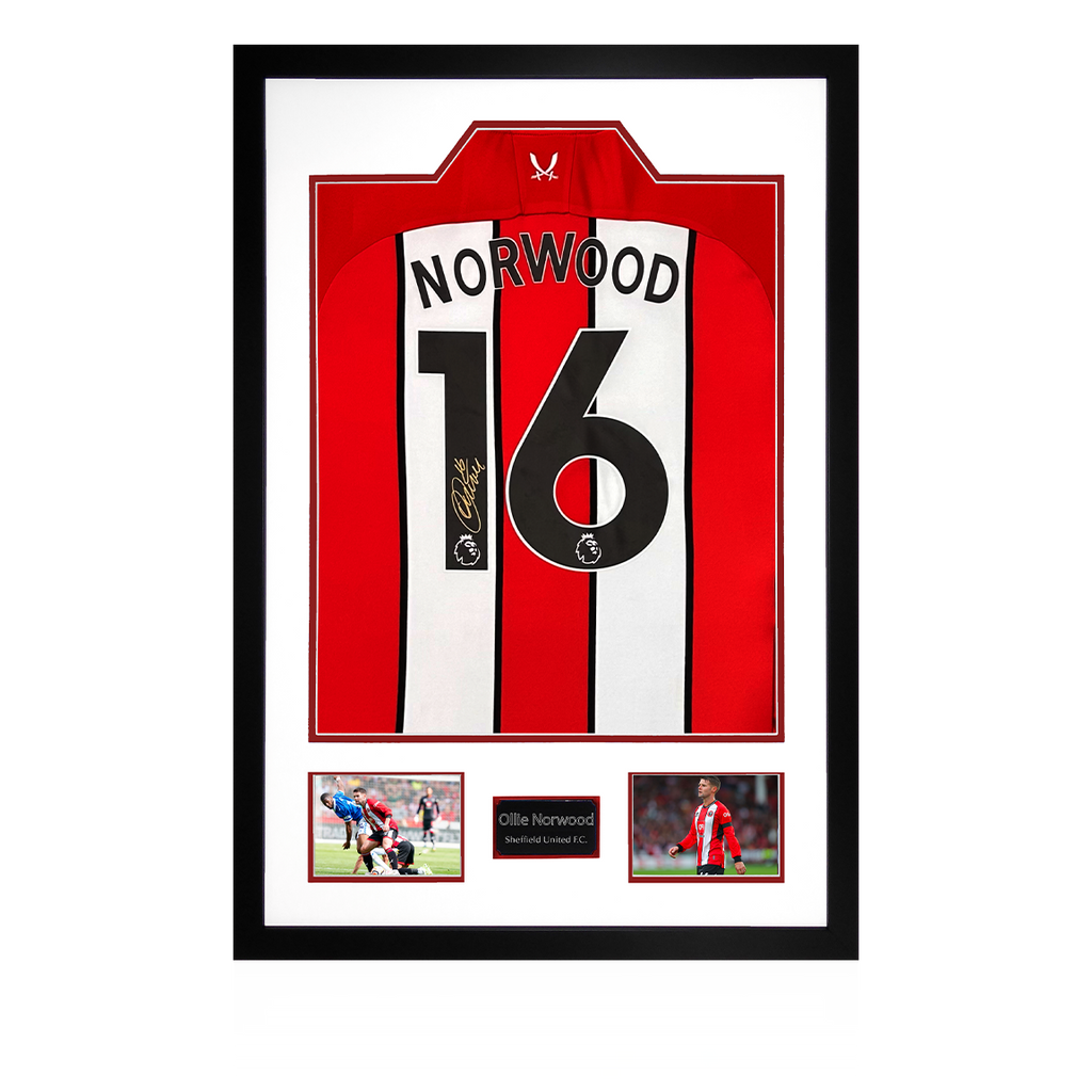Wooden framed SUFC display containing an etched plaque and a shirt signed by midfielder Ollie Norwood. Having started off on loan at Sheffield United, Ollie was signed by the blades in 2019 and has seen two promotions to the pr...