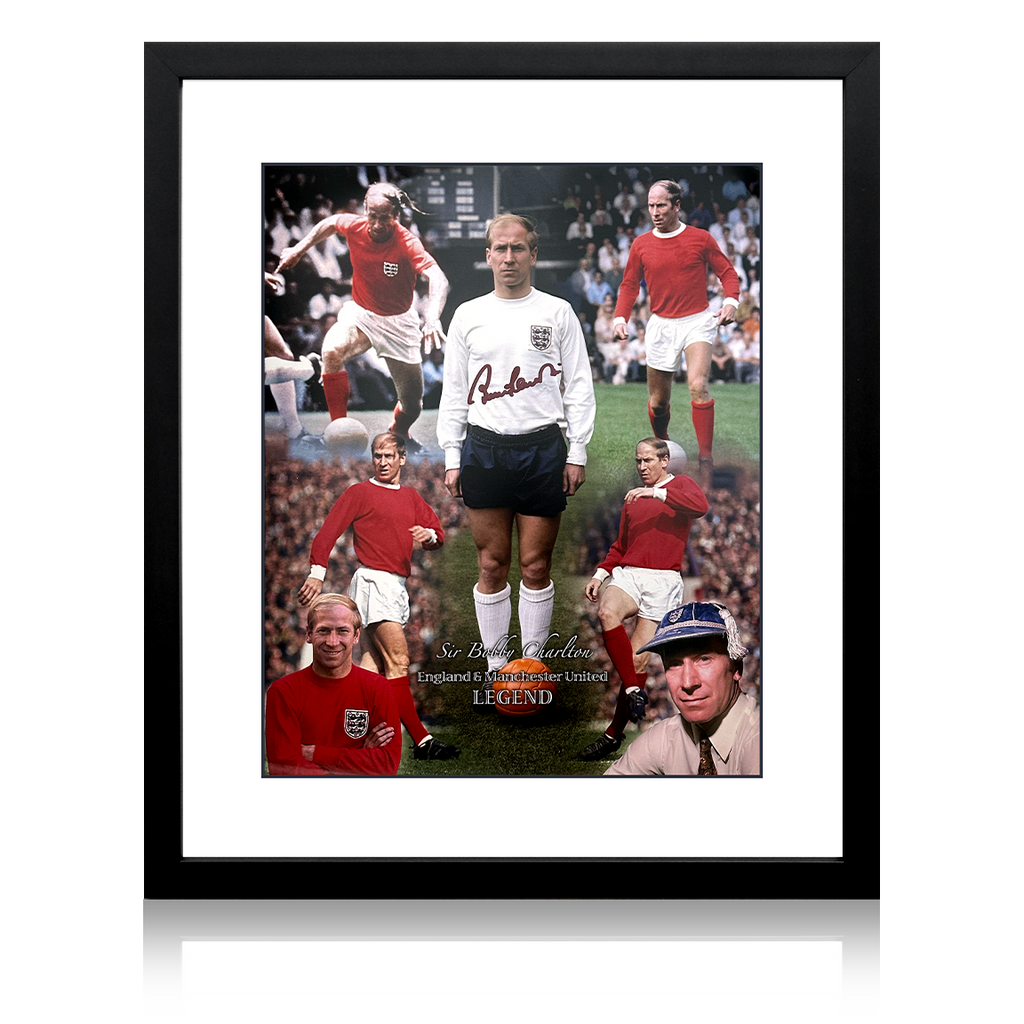 Signed, mounted and wooden framed display of England and Manchester United legend. Sir Bobby Charlton