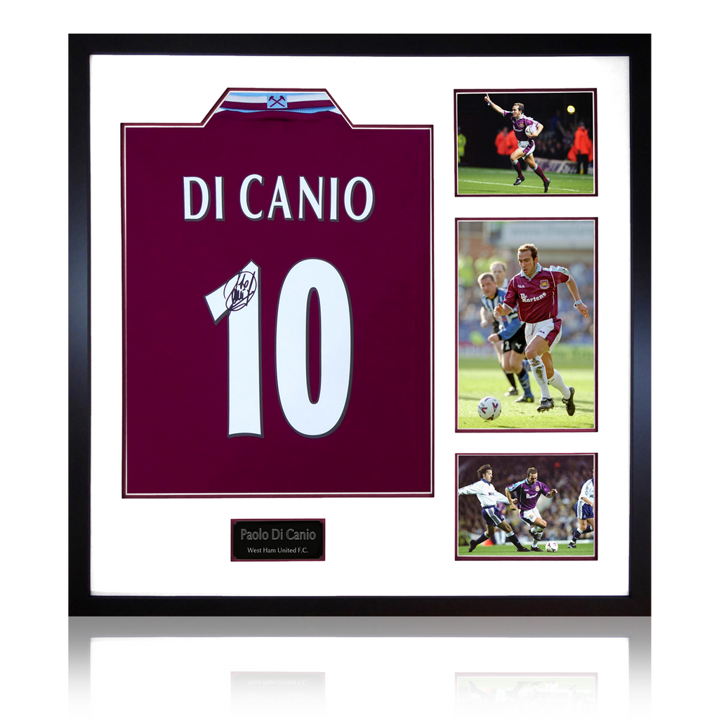 2000 West Ham Home Shirt Display Signed by Paolo Di Canio. These are wooden framed and contain 3 iconic photos and an etched plaque