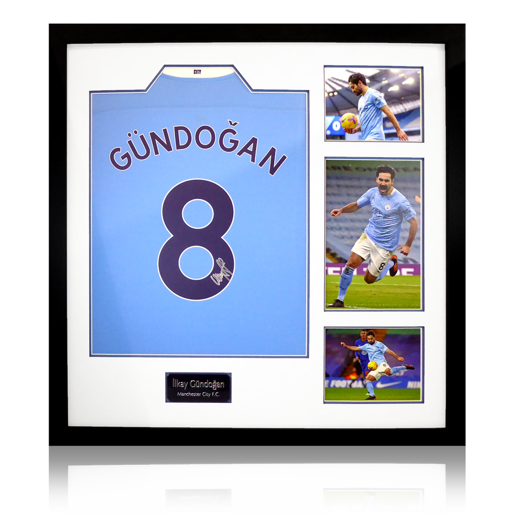 3 photo signed shirt display by Ilkay Gundogan. So far in his Manchester City career his has won 11 trophies with the club which include 4 Premier League titles, 1 FA Cup, 2 Community Shields and 4 League Cups in a row.