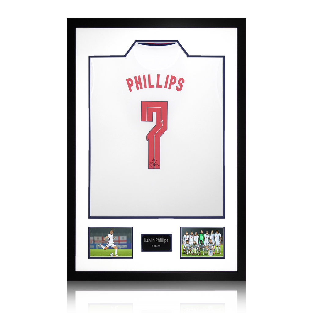 2 photo signed shirt display by Kalvin Phillips. He made his England debut on 08/09/20 when he started against rivals Wales in a 3-0 victory.