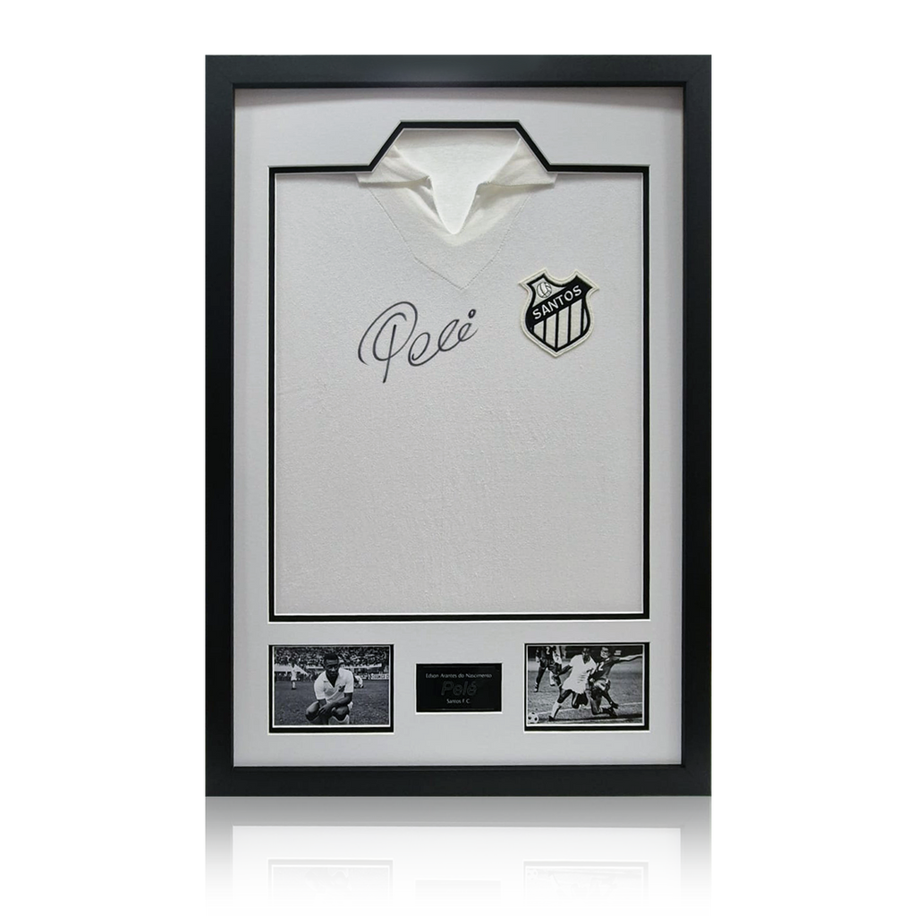 Retro style Santos football shirt display signed by sporting icon; Pele. This wooden framed presentation contains a custom plaque and 2 iconic photos of the man who's incredible career lasted 21 years in which he won 3 of the 4...