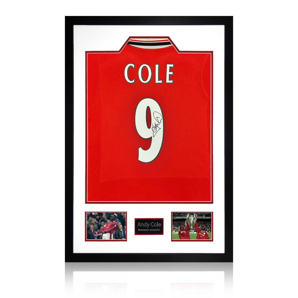 A signed Manchester United home shirt by Andy Cole in a Premium Frame. This item measures approximately 800mm x 650mm.This item is accompanied with an certificate of authenticity from The Fan Cave.