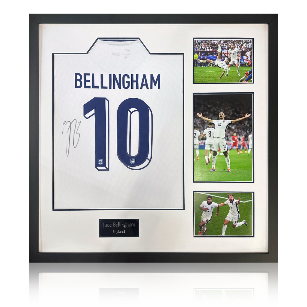 3 photo signed shirt display by Jude Bellingham. This item measures approximately 820mm x 820mm. This item is accompanied with an certificate of authenticity from The Fan Cave.