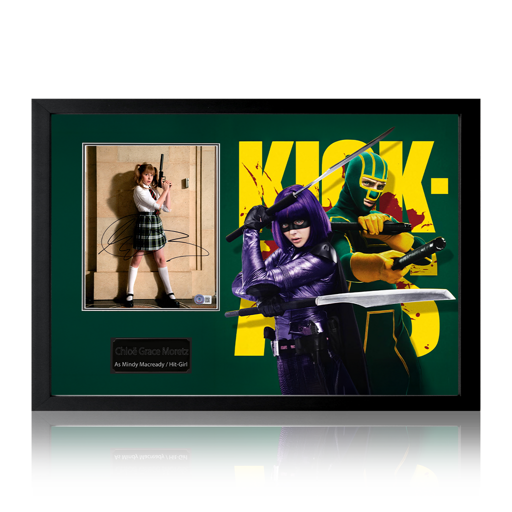 Wonderfully presented framed display of Chloë Grace Moretz as Mindy Macready/Hit-Girl in Kick-Ass. This display containing a signed photo of Chloë Grace Moretz, has been mounted in a print of the poster from the movie and...