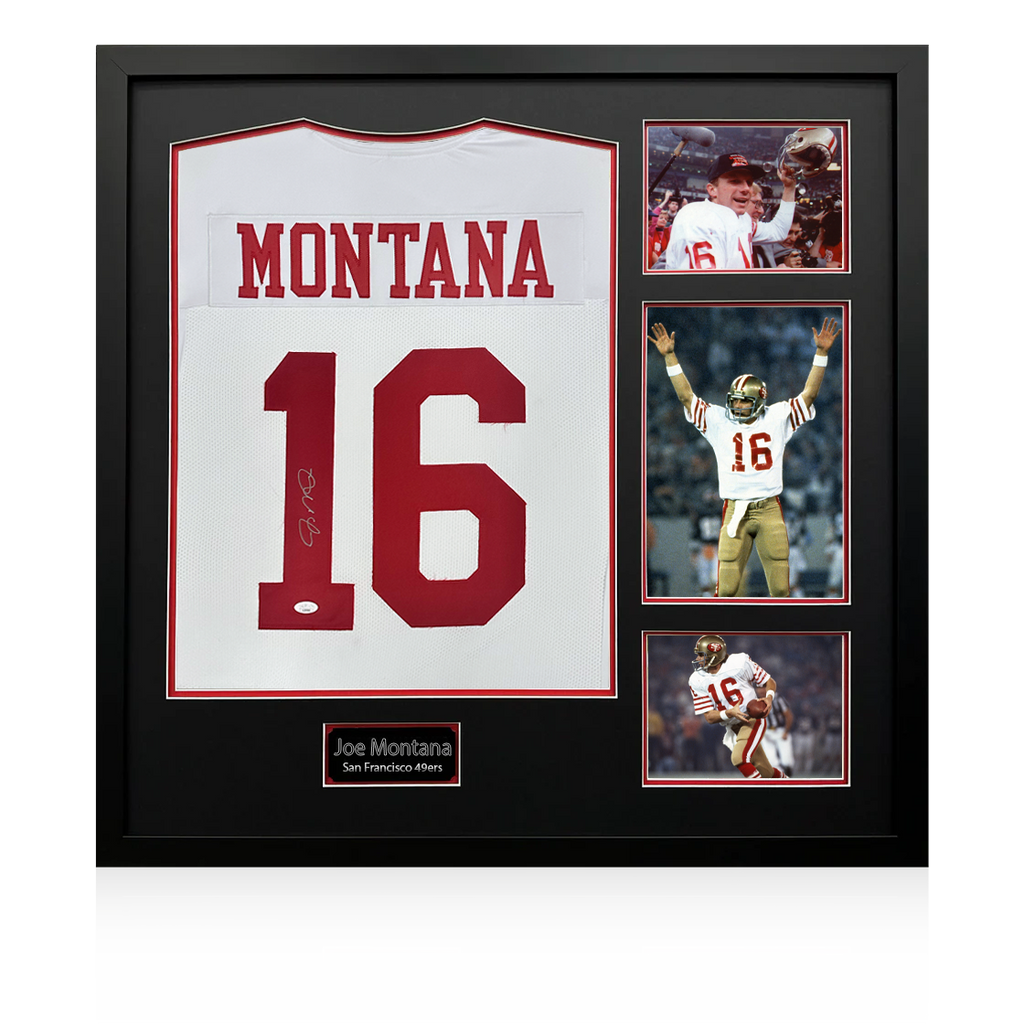 San Francisco 49ers jersey hand-signed by Joe Montana. The autograph includes an official JSA Authentication Services serially numbered hologram for authenticity purposes. The signing of this item was witnessed by JSA.