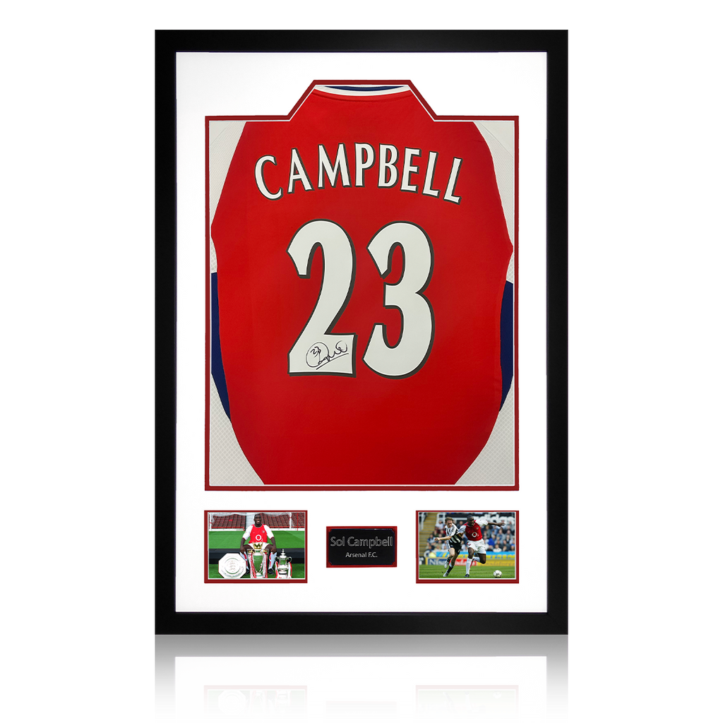 A signed Arsenal shirt by Sol Campbell in a Premium Frame. The item was signed at a private signing on the 06/03/25. This item is accompanied with an certificate of authenticity from The Fan Cave.