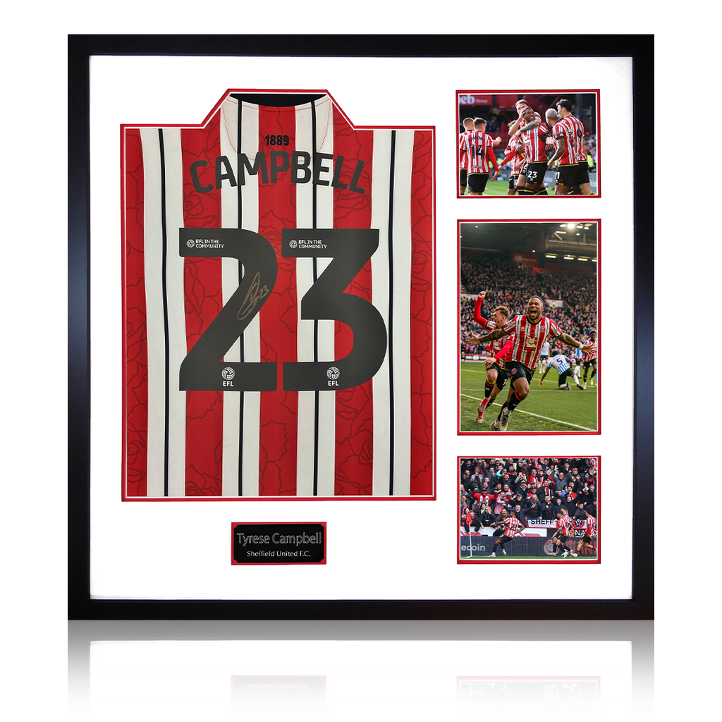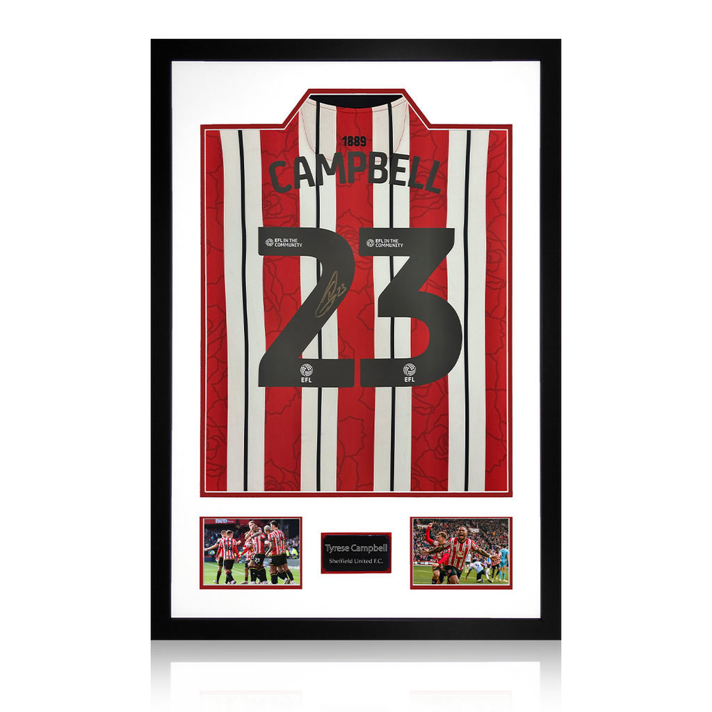 Wooden framed SUFC display containing an etched plaque and a shirt signed by striker Tyrese Campbell. These are Sheffield United official shirts by signed at a private signing exclusively with The Fan Cave in 2025! This item co...