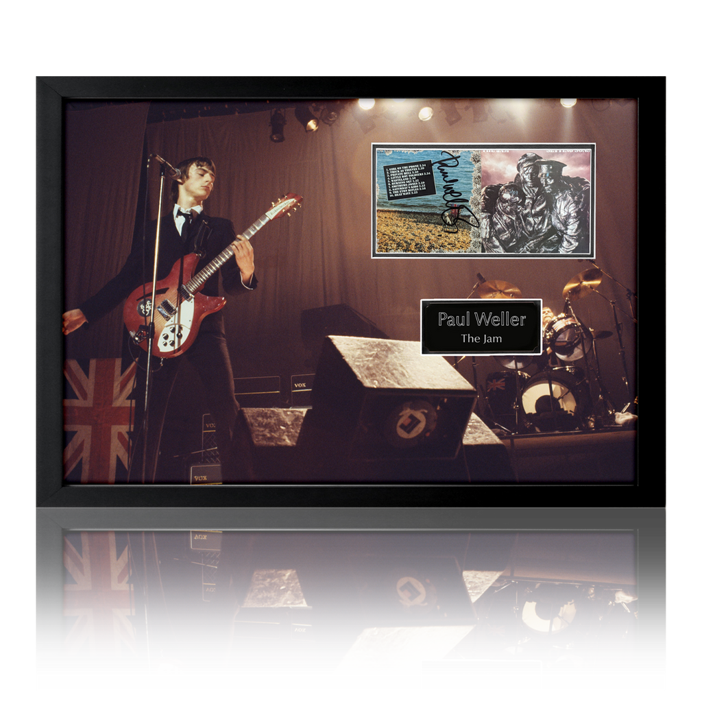 Wooden framed poster display of mod revival/punk rock band "The Jam" This presentation contains an etched plaque and index card signed by frontman; Paul Weller.