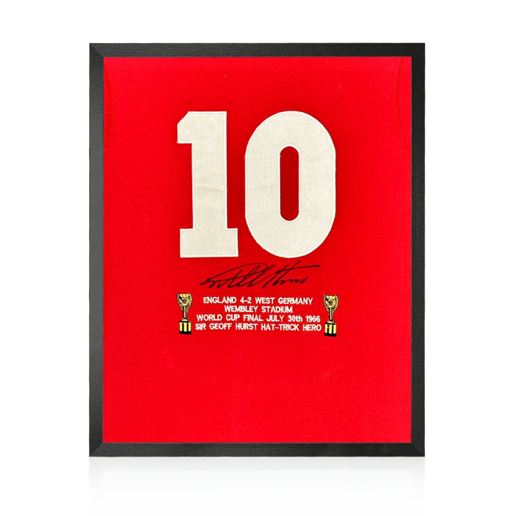 Framed England 1966 shirt. Signed by the only player to score a hat-trick in a World Cup Final and win, Sir Geoff Hurst.