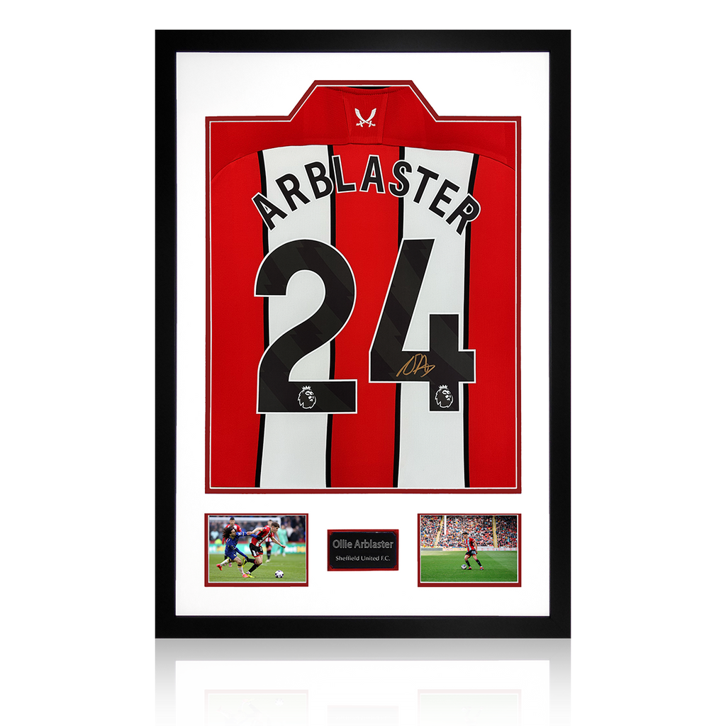 Wooden framed SUFC display containing an etched plaque and a shirt signed by midfielder Ollie Arblaster. These are Sheffield United official shirts by signed at a private signing exclusively with The Fan Cave in 2024!