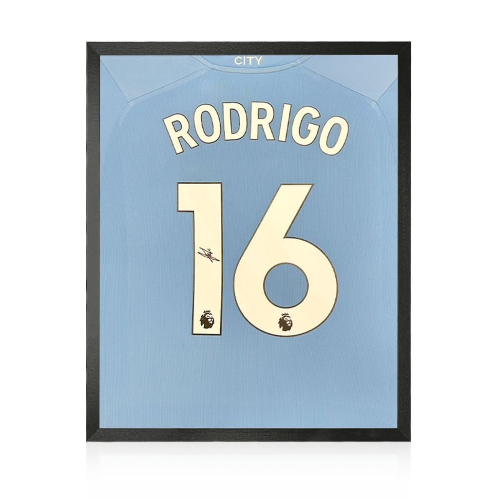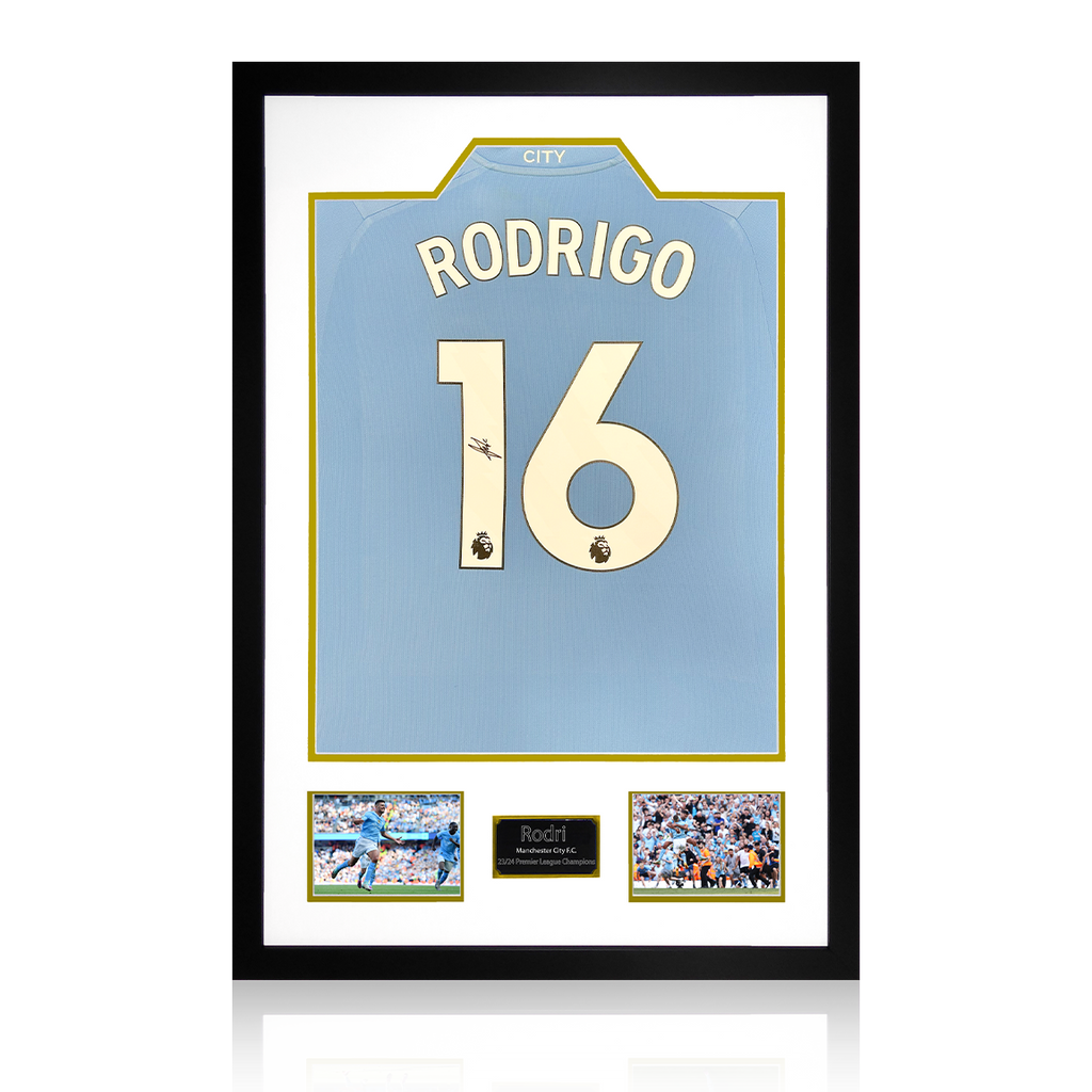 2 photo Premier League Champions shirt display signed by Rodri. Manchester City was crowned 23/24 Premier League Champions on Sunday 19th May. City beat West Ham 3-1 which sealed their fourth title in a row! Goals coming from P...