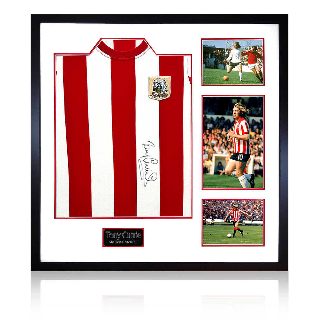 3 photo signed shirt display by Tony Currie who scored 54 goals in 313 league appearances for Sheffield United. Tony also has a stand named after him at Bramall Lane in his honour. This item measures approximately 820mm x 820mm