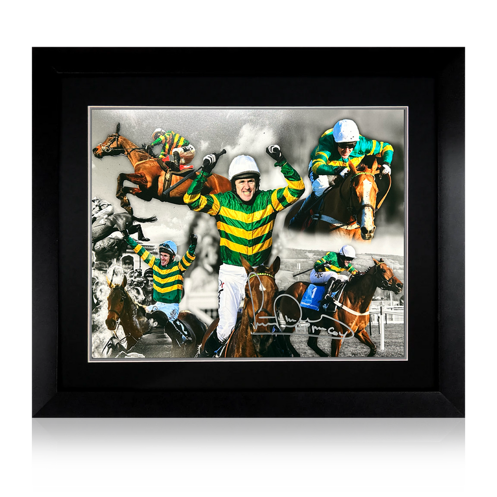 Montage mount display in a wooden frame, signed by one of the most successful Jockeys in horse racing; Sir Anthony Peter (AP) McCoy.