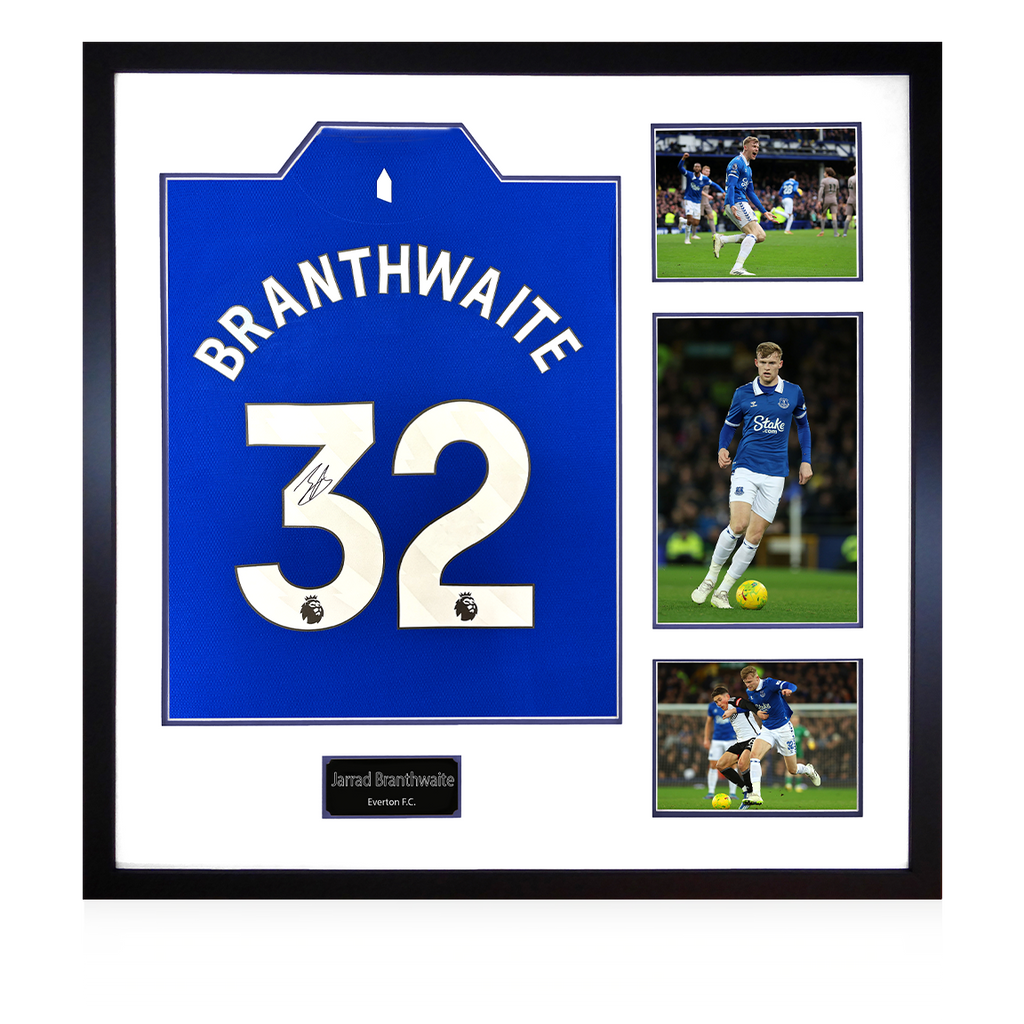 Beautifully presented Elite Frame with signed Everton shirt from Jarrad Branthwaite. This item was signed at an exclusive Fan Cave signing with Jarrad on the 29/02/24. The frame measures approximately 820mm x 820mm. This item i...