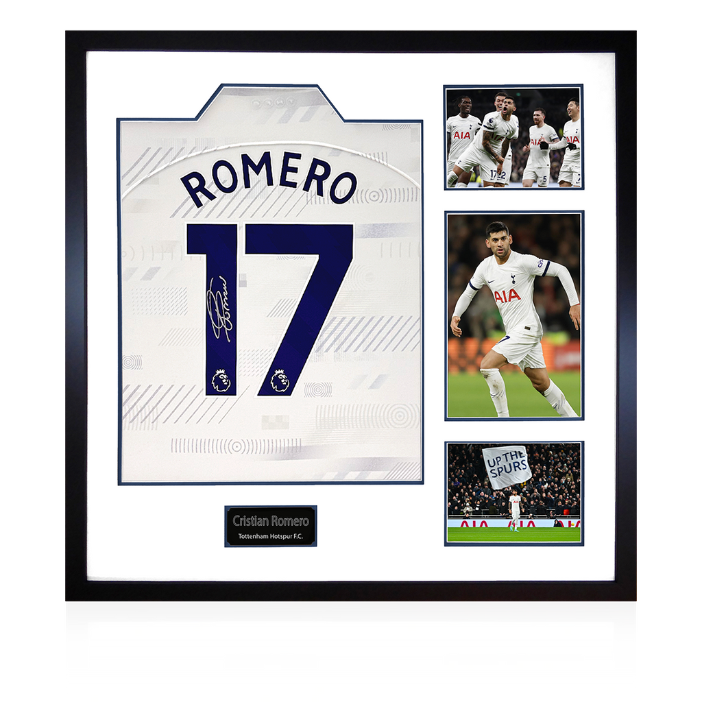 Beautifully presented Elite Frame with signed Liverpool 23/24 shirt from Cristian Romero. This item measures approximately 820mm x 820mm. This item is accompanied with an certificate of authenticity from The Fan Cave.