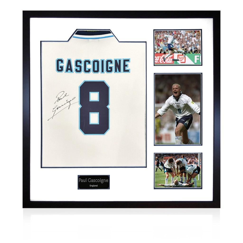 England Euro 96 shirt display signed by English footballing legend Paul Gascoigne who's famous "denist chair" celebration after scoring his iconic goal against Scotland is one of English footballs most memorable moments.