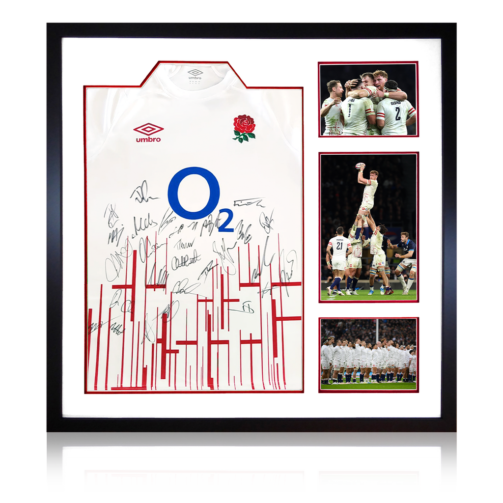 3 photo signed shirt display by the Rugby England Squad. Including Danny Care, Henry Slade, Joe Marler, Marcus Smith, Ben Youngs, Ellis Genge, Courtney Lawes, Dan Cole & Joe Marler. Signed at a private signing at the Englan...