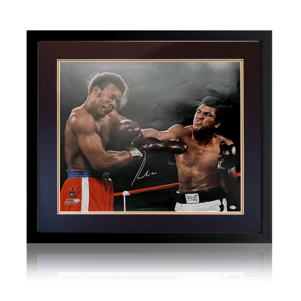 A signed display in a wooden frame, of the iconic fight in Kinshasa, Zaire (now the Democratic Republic of the Congo) where Muhammad Ali defeated George Foreman to become a two-time World Heavyweight Champion. This piece comes ...