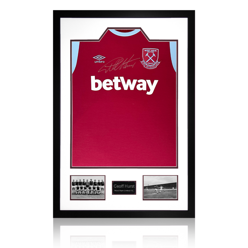 Beautifully presented Premium Frame with signed West Ham shirt by Geoff Hurst. This item was signed at an exclusive Fan Cave signing with Geoff. The frame measures approximately 850mm x 600mm. This item is accompanied with an c...