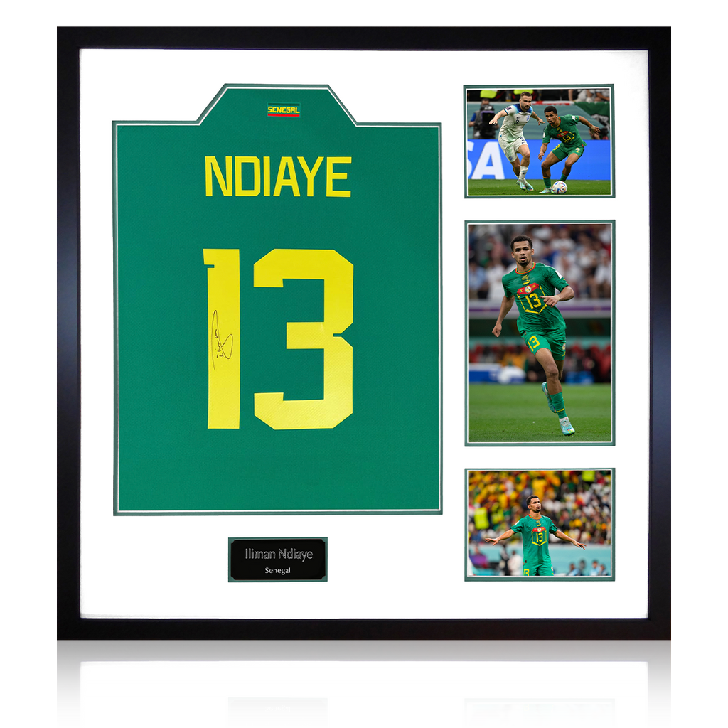 Wooden framed Senegal display containing an etched plaque, three photos and a shirt signed by striker Iliman Ndiaye. These are Senegal official shirts by signed at a private signing exclusively with The Fan Cave in 2022!