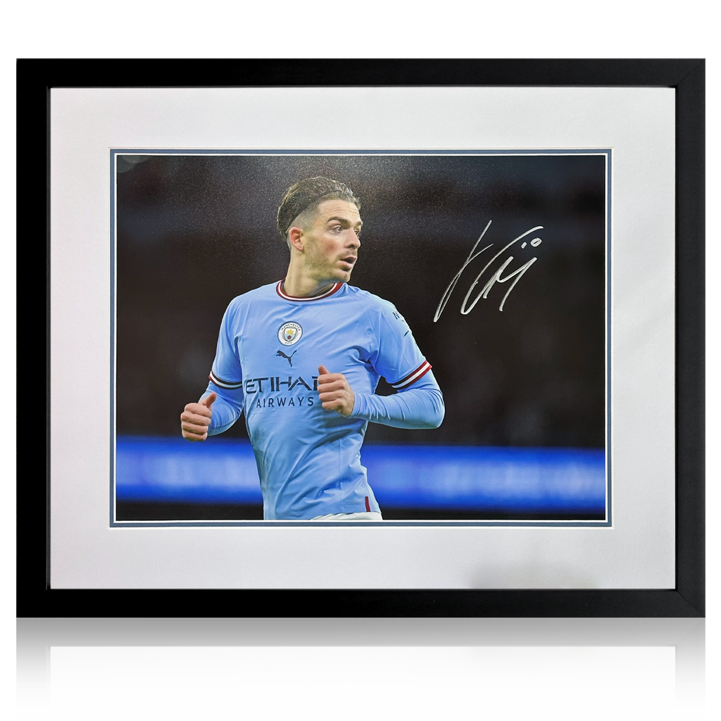 Photo signed Manchester City display by Jack Grealish. He signed for Manchester City on 05/08/21 where he signed for a fee of around £100,000,000 which would make him the most expensive transfer of an English player in foot...
