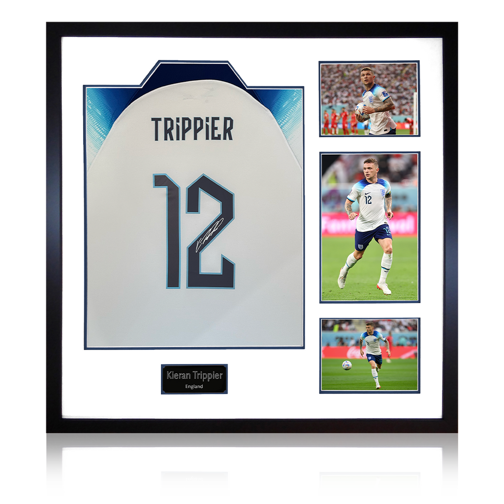 A framed 2022/2023 England signed shirt by Kieran Trippier who made his senior international debut in June 2017 and was part of the team that reached the semi-finals of the 2018 FIFA World Cup. This item was signed at an ex...