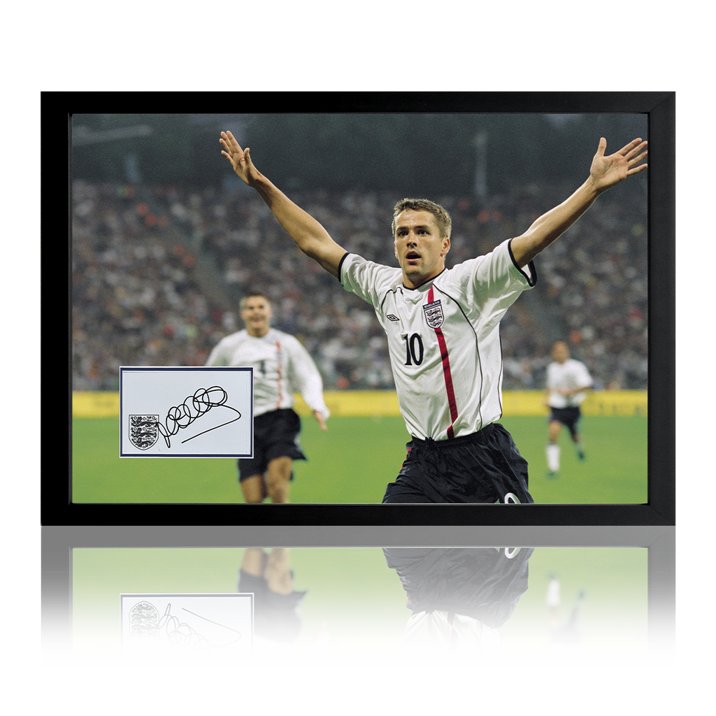 Wooden framed poster mount display containing a signed card from English Football star Michael Owen. He competed in 89 games for the Three Lions scoring 40 goals. He was known for being a prolific goal scorer and the only playe...