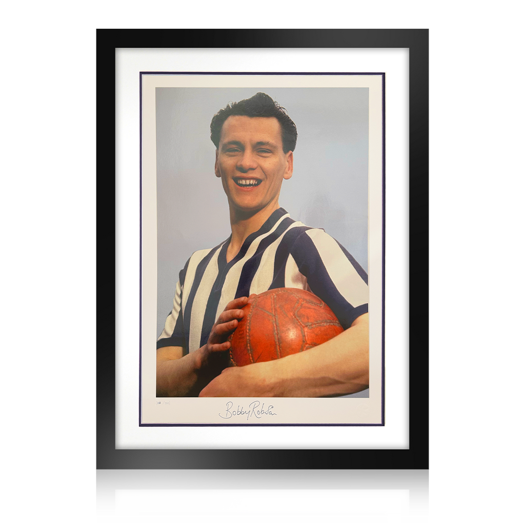 Wooden framed display of footballing legend Sir Bobby Robson during his playing days at West Bromwich Albion. This image has been signed by Sir Bobby and would make a great addition to any classic football or West Brom collection.