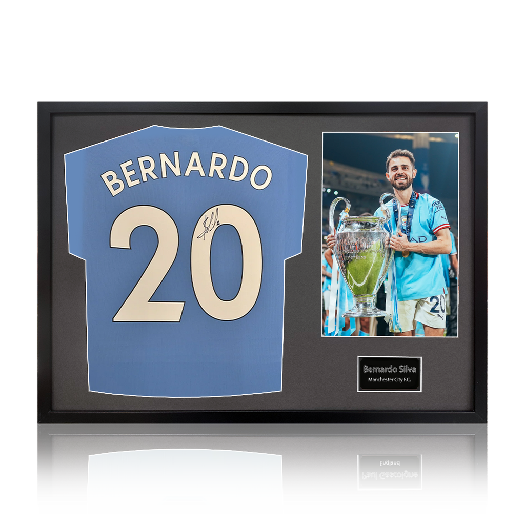 Single photo Premier League Champions shirt display signed by Bernardo Silva with fan style numbers. Manchester City was crowned 23/24 Premier League Champions on Sunday 19th May. City beat West Ham 3-1 which sealed their fourt...