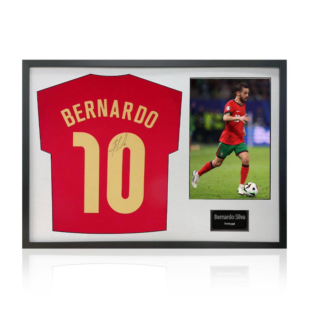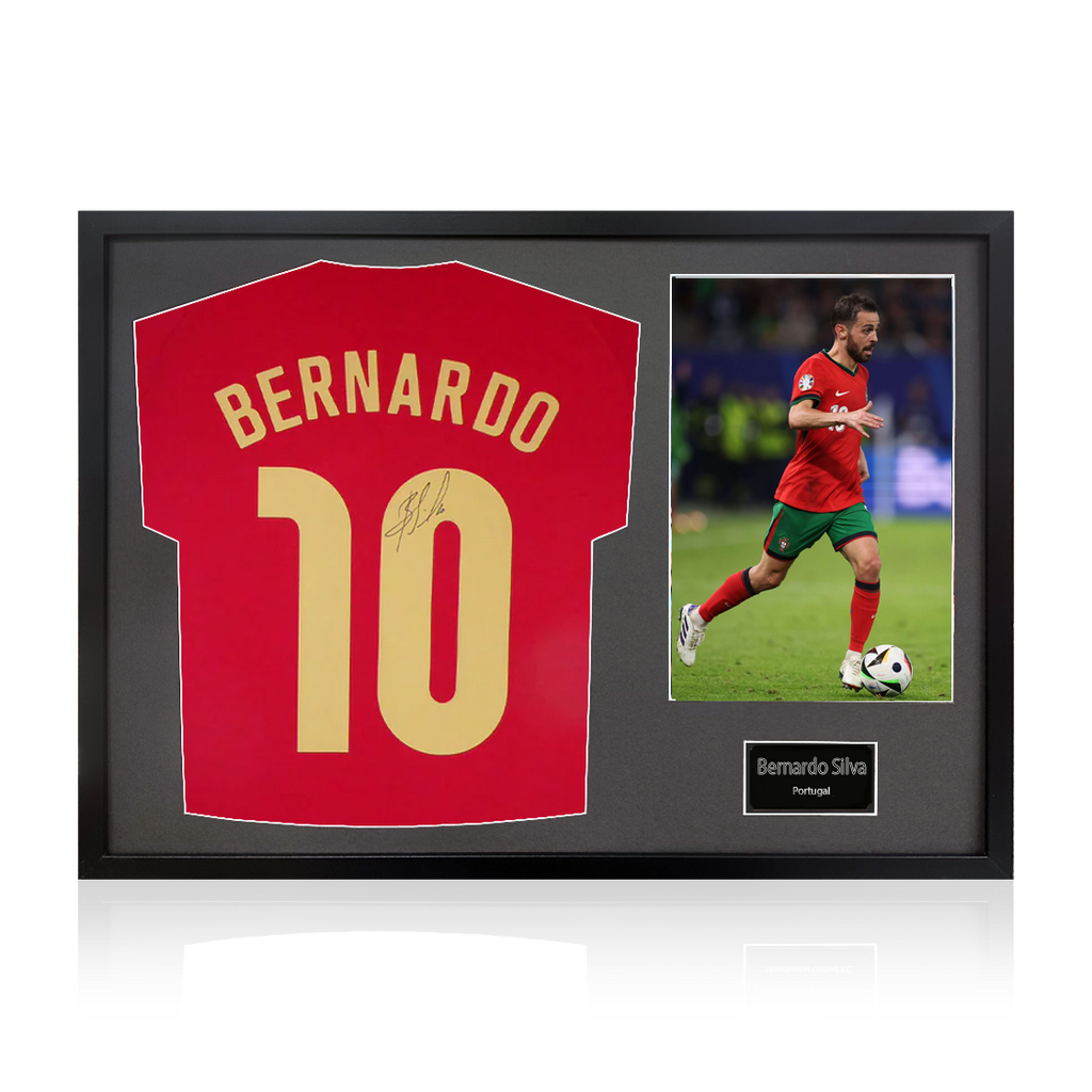 Wooden Framed 1 photo signed shirt display by Bernardo Silva. He made his Portugal debut on 31/03/15 when he started against Cape Verde. He also won the first ever Nations League with Portugal in 2019 after beating Netherla...