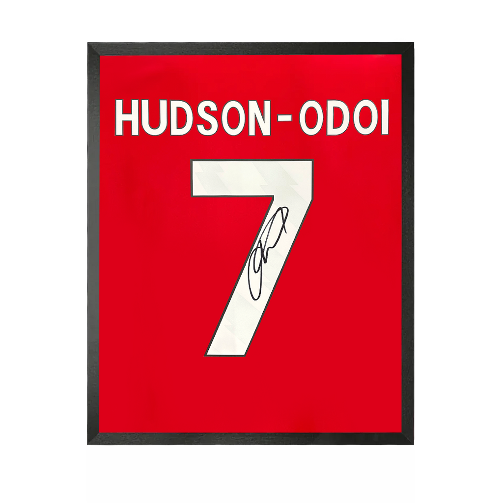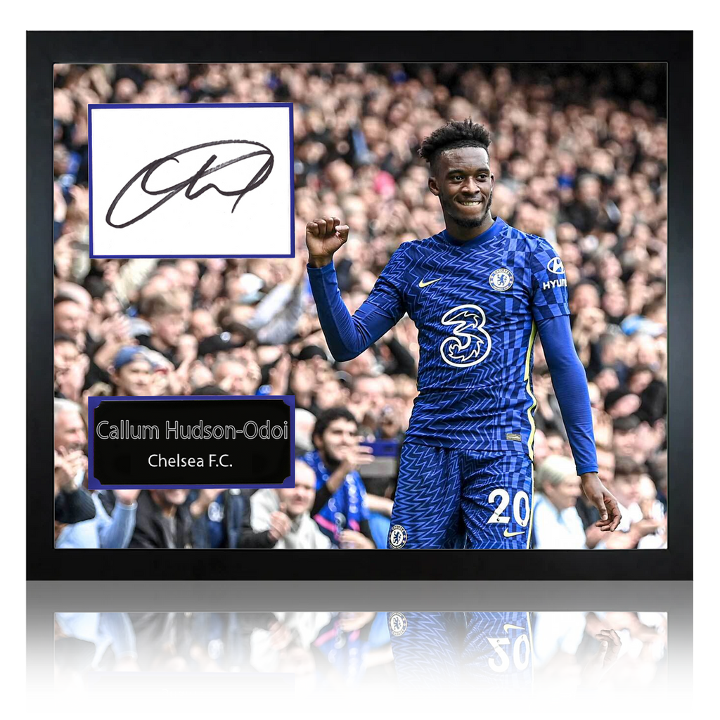 Signed mounted index card of former Chelsea forward Callum Hudson-Odoi. These mounts are designed to fit an off the shelf size frame and make a great addition to any collection. This item measures approximately 500mm x 400mm. S...